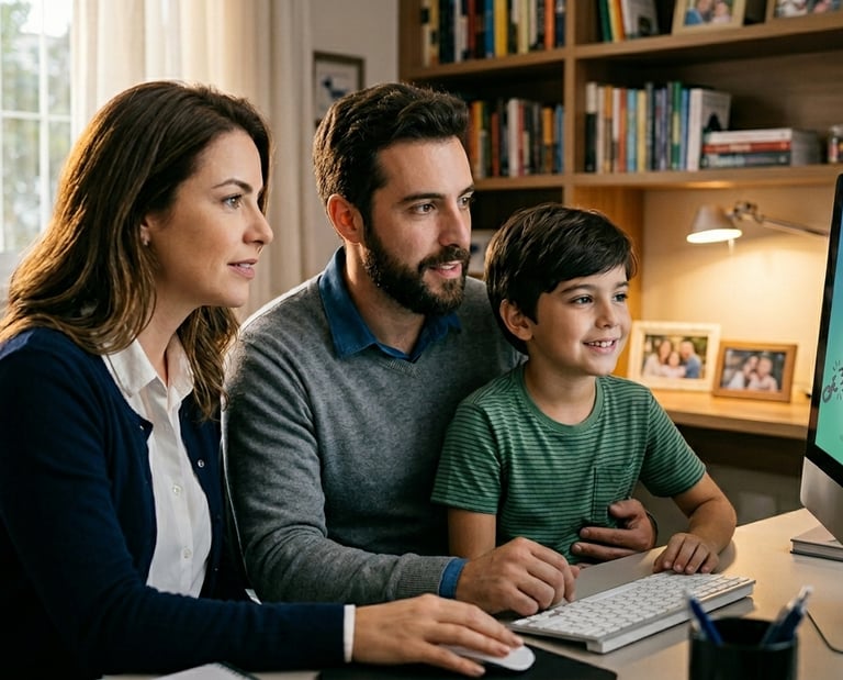 A warm family sitting together at a table, reviewing financial documents with a laptop open.